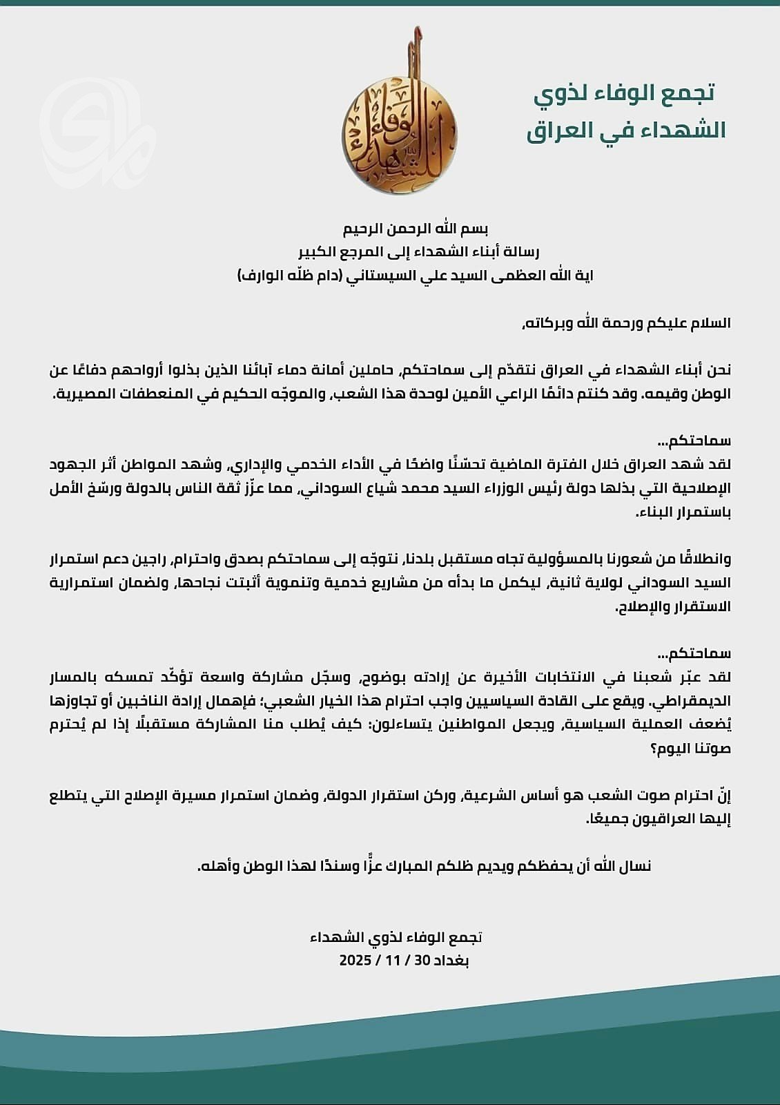 تجمع الوفاء لذوي الشهداء يوجّه رسالة إلى السيستاني ويؤكد دعمه لمسار الدولة