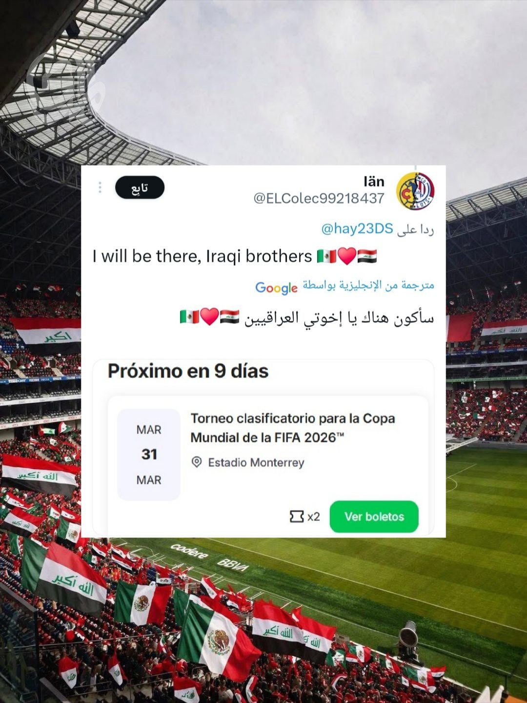 تجاوزت مبيعات تذاكر مواجهة منتخب العراق مع الفائز من مباراة بوليفيا وسورينام في الملحق العالمي المؤهل لكأس العالم 2026 حاجز الـ 20 ألف تذكرة، ما دفع اللجنة المنظمة لفتح أجزاء من المقاعد العليا لملعب “مونتيري” الذي يتسع لنحو 53,500 متفرج، لاستيعاب الإقبال الجماهيري الكبير.