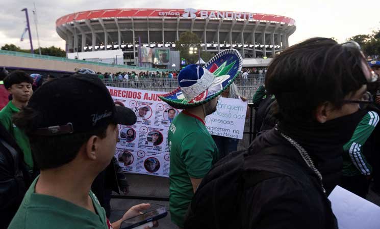 مشجعو كرة القدم أمام ملصقات لأشخاص مفقودين خلال مباراة في المكسيك