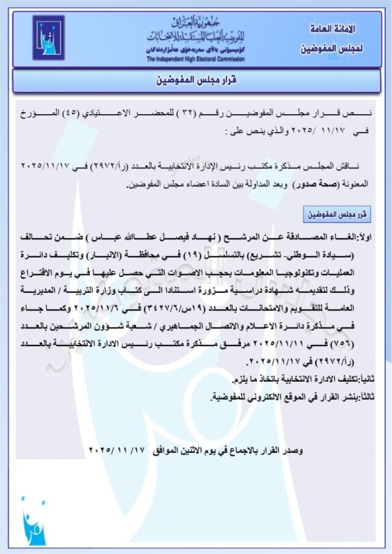 كما شمل الاستبعاد المرشح عن تحالف الحسم الوطني خضير عليوي جبار ركاض لعدم تقديمه وثيقة دراسية جديدة خاصة بترشيحه.