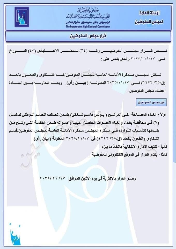 كما شمل الاستبعاد المرشح ضمن تحالف الحسم الوطني يونس قاسم شغاتي، وإلغاء الأصوات التي حصل عليها، كما قررت المفوضية استبعاد المرشحة هبة توفيق حمزة ضمن تحالف الحسم الوطني وحجب الأصوات التي حصلت عليها.