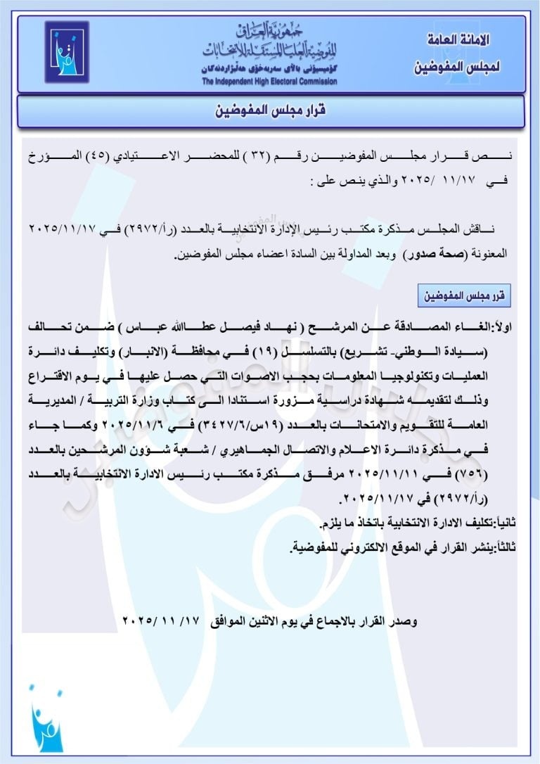 كما شمل الاستبعاد المرشح عن تحالف الحسم الوطني خضير عليوي جبار ركاض لعدم تقديمه وثيقة دراسية جديدة خاصة بترشيحه.