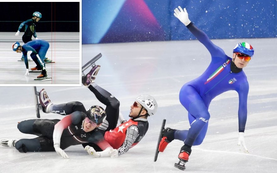 وكاد المتزلج الإيطالي أن يسقط بدوره بعدما لامس نصل حذائه يد أحد المتسابقين الساقطين، إلا أنه استعاد توازنه بسرعة، وأدار جسده 180 درجة ليعبر خط النهاية إلى الخلف.