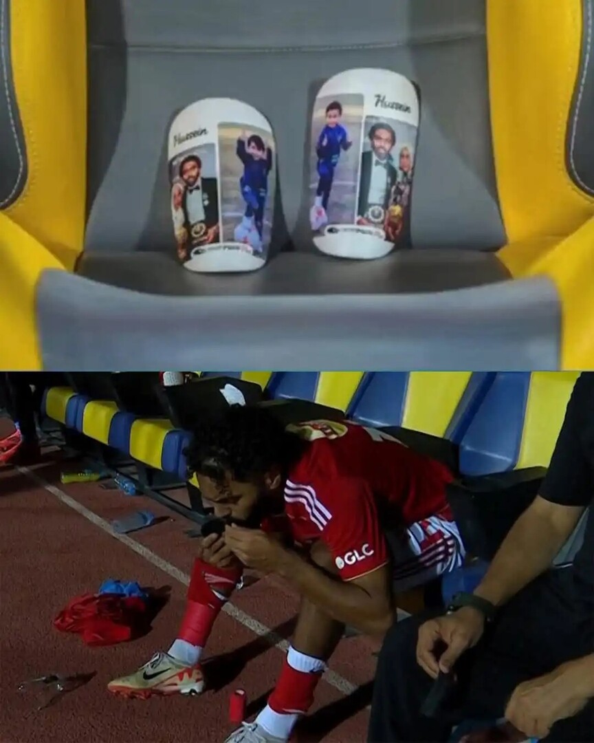 حسين الشحات كان يُقبل صور عائلته التي يضعها على واقي الساق قبل نزوله أمام الزمالك 📷 pic.twitter.com/N9VZNQgueR