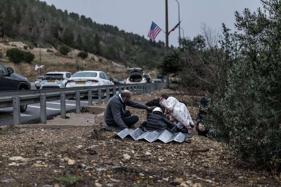 إسرائيليون يحتمون على جانب طريق سريع بين حيفا والقدس، خلال هجوم صاروخي إيراني، 1 أبريل 2026
