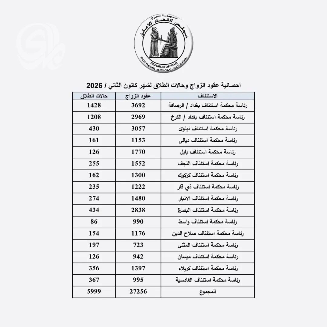 أعلن مجلس القضاء الأعلى في العراق، اليوم الثلاثاء، تسجيل 27 ألفاً و256 عقد زواج مقابل 5 آلاف و999 حالة طلاق في عموم محاكم الاستئناف خلال شهر كانون الثاني 2026.